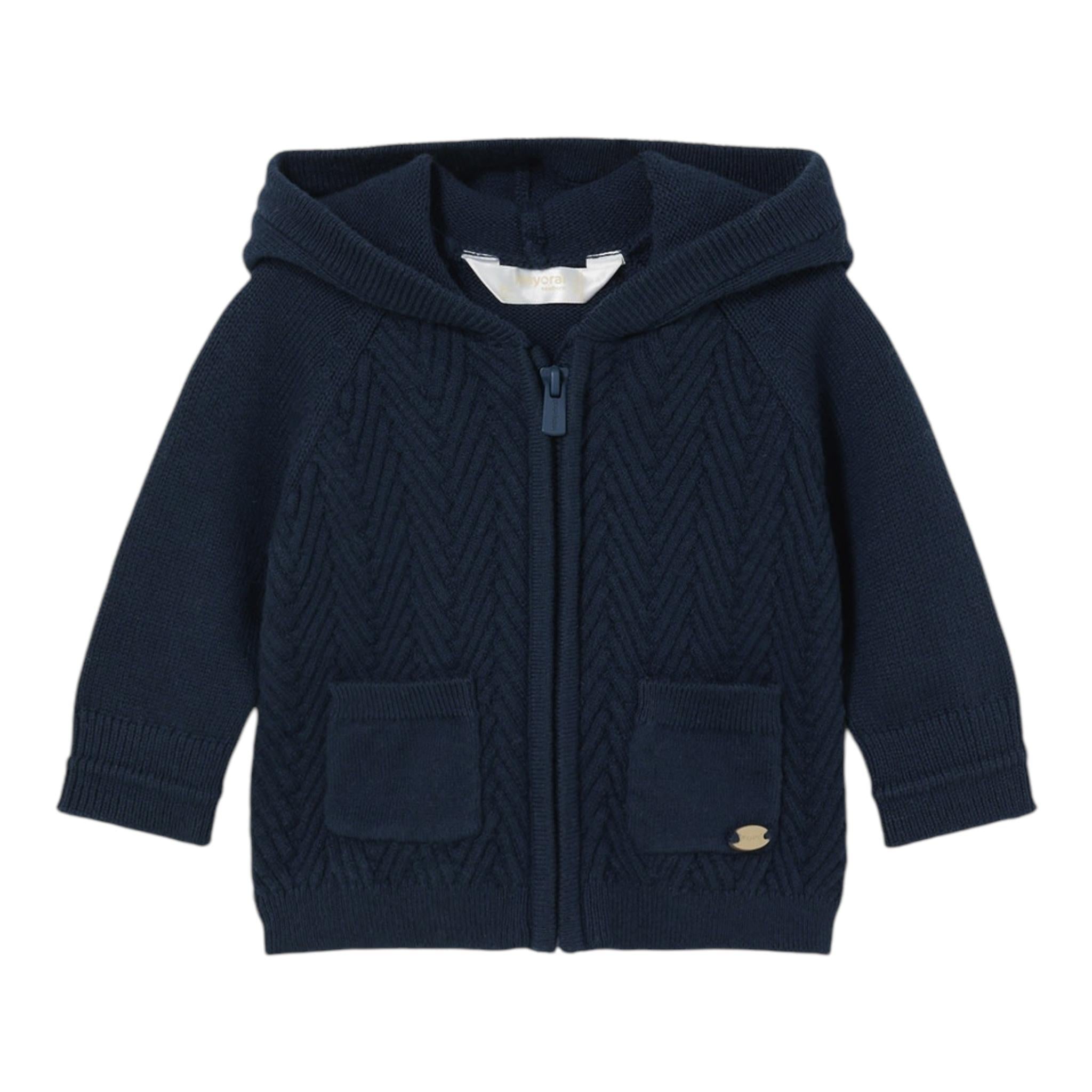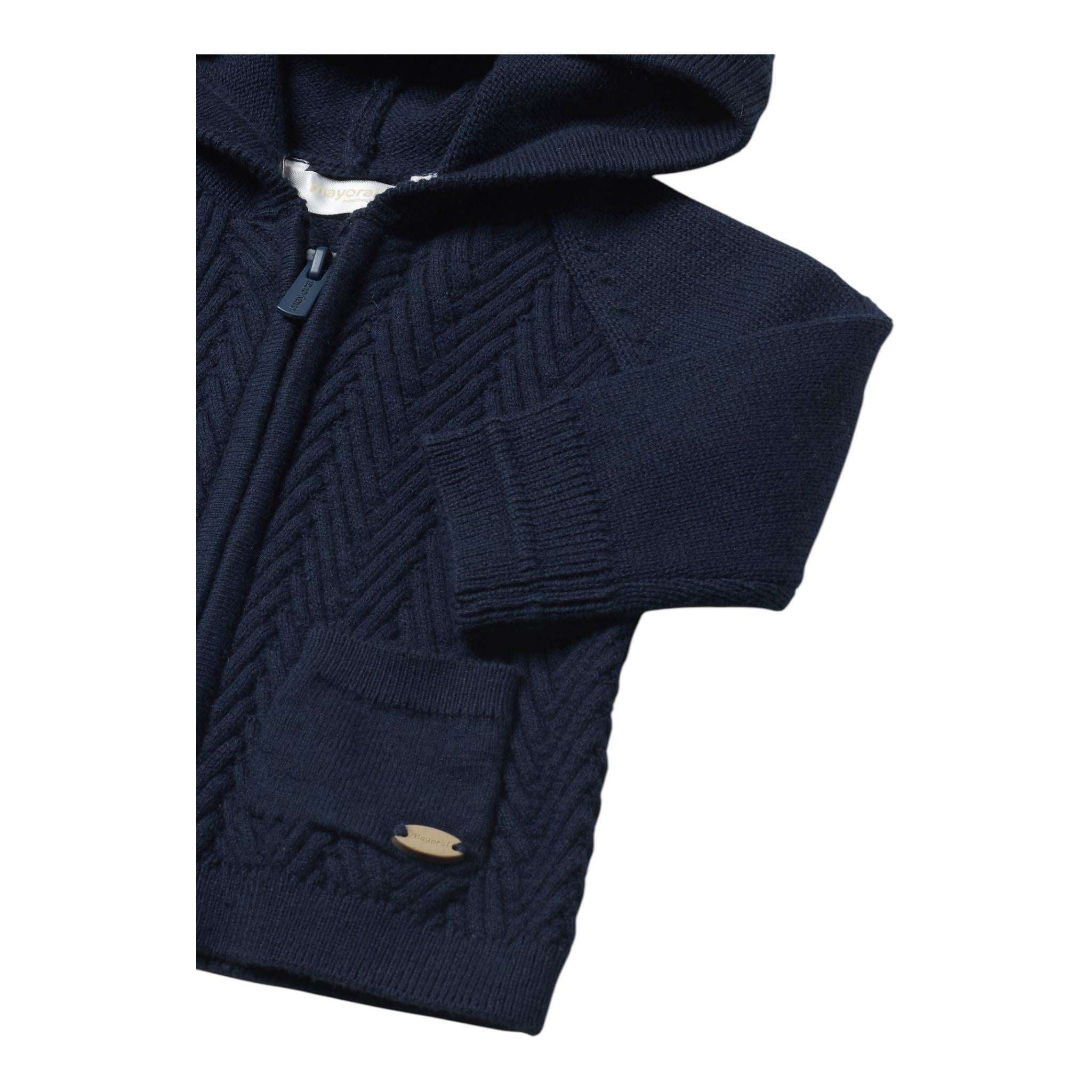 MAYORAL cardigan tinta unita con cappuccio e zip firmata MAYORAL. Realizzata in: 60% cotone 30% poliammide 10% lana. Articolo per: Neonato